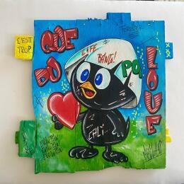 The artist used Acrylic, Wood, Posca media on Wood to create this Pop-art, Small size painting.