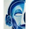 This unique work of art is a portrait of a person in front, with a single hand on his right, made of a single continuous white line in Posca, filled with colored pencils to create volumes of face like a mask, with a very different texture in the background, giving a sense of depth of field. Generally based on blue and violet colors.