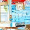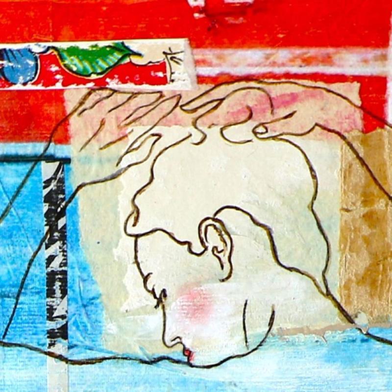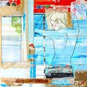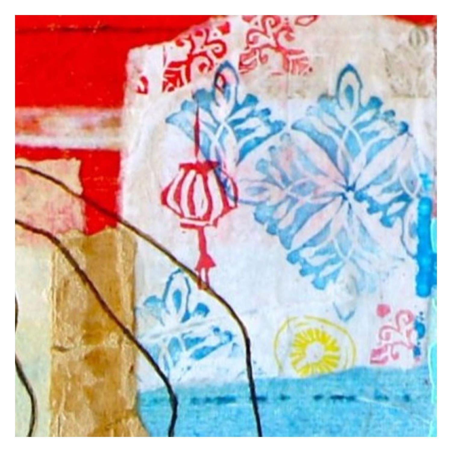 The artist used mixed media, Stamping, Ink, Acrylic, Collage d'art, Upcycling to create this small-format canvas on Wood Singular Art style painting on the theme Scenes de vie.