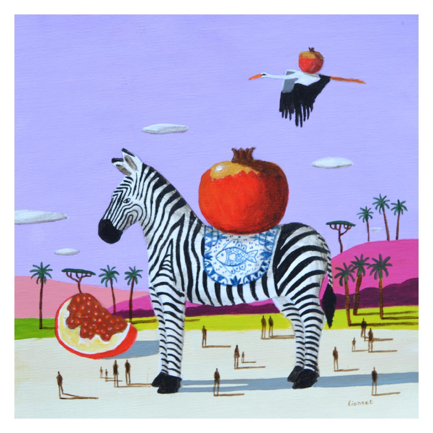 This unique and original contemporary artwork "zèbre et cigogne aux grenades" on the subjects of Animals, Still-life, Life style has been created by the contemporary artist Lionnet Pascal.
