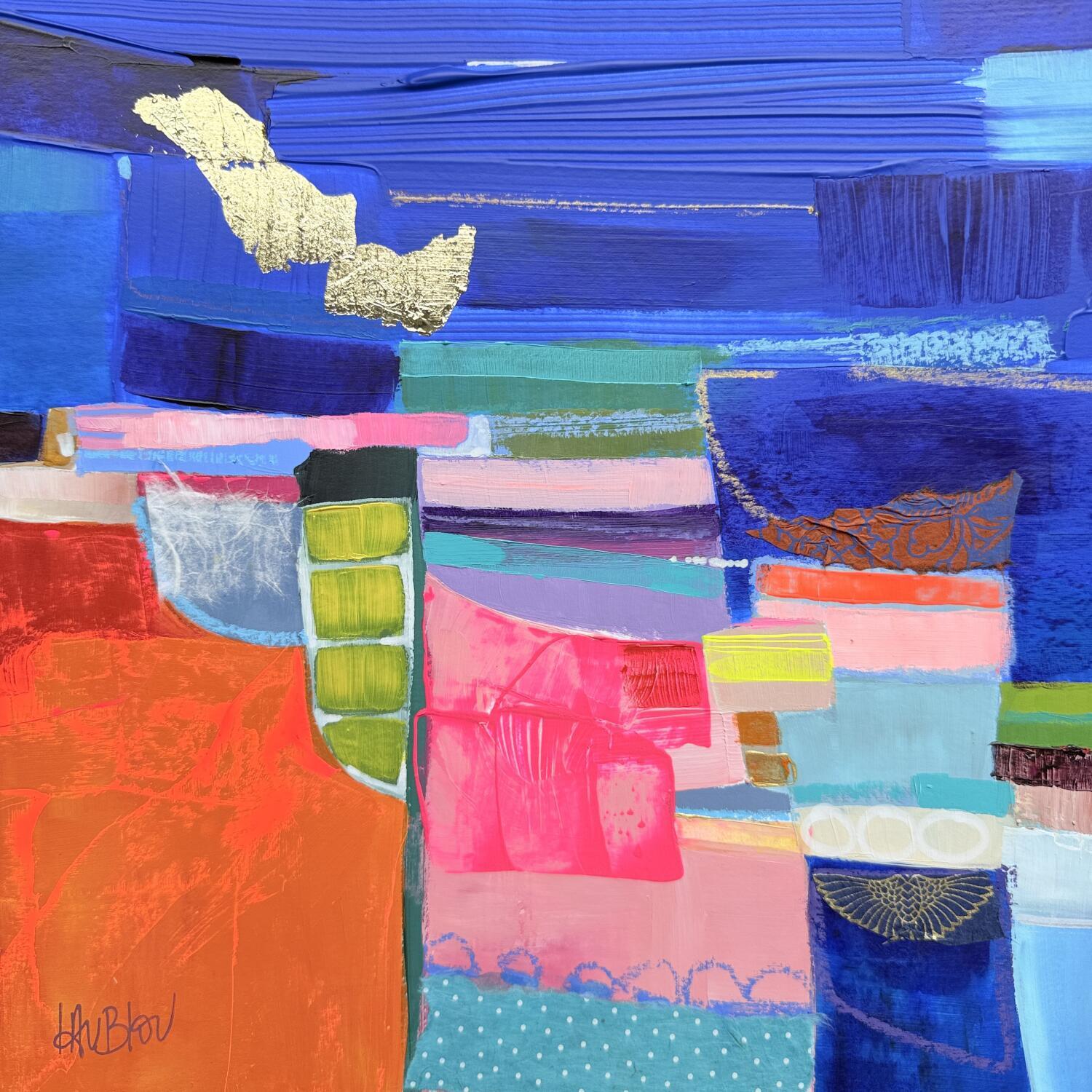 The artist used Acrylic, Cardboard, Gluing, Gold leaf, Pastel media on Cardboard to create this Abstract, Small size painting.