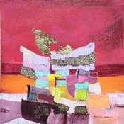 The artist used Acrylic, Gluing, Gold leaf, Pastel media on Cardboard to create this Abstract, Small size painting.