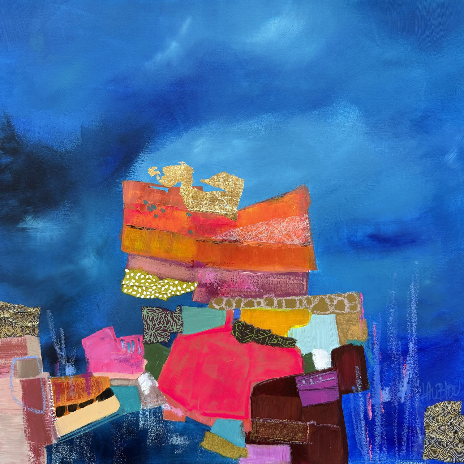 The artist used Gold leaf, Pastel, Acrylic, Cardboard, Gluing media on Canvas to create this Abstract, Small size painting.