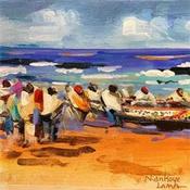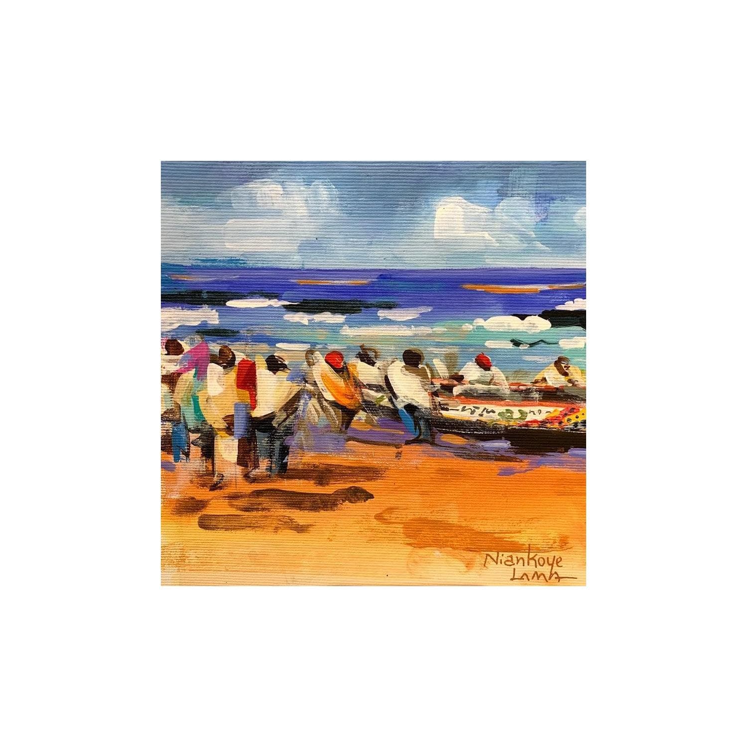 This unique and original contemporary artwork "L'ARRIVEE DES PECHEURS" on the subject of Life style has been created by the contemporary artist Lama Niankoye.