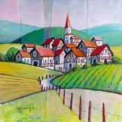 This unique and original contemporary artwork "VILLAGE ALSACIEN" on the subjects of Urban, Nature, Landscapes has been created by the contemporary artist Burgi Roger.