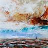 Paris" represents the city in a metaphorical, non-figurative way. She chooses an overhanging vantage point to highlight the capital's rooftops, whose reliefs and ridges create an undulating, almost maritime movement, accentuated by the liquidity of the paint. The motif is painted in oil and palette knife, playing on oppositions between warm (shades of red) and cool (shades of blue and green) colors. The proportions of the painting, two-thirds of which is dominated by the sky, are designed to accentuate the perspective and majesty of the motif. The sky, moreover, echoes the opposition between cold (left) and warm (right) hues, the two masses being linked by the stringy, torn clouds that give depth to the space.