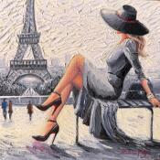“La Belle Parisienne” - Oil on Canvas sized 19x19 cm by Diana Pigni. A timeless moment of grace in the heart of Paris. This impressionistic painting captures a stylish woman in a minimalistic yet luxurious composition, seated near the Eiffel Tower. Rich texture created with bold palette knife strokes brings movement and depth to every detail. A refined collector’s piece that radiates sophistication and feminine strength.