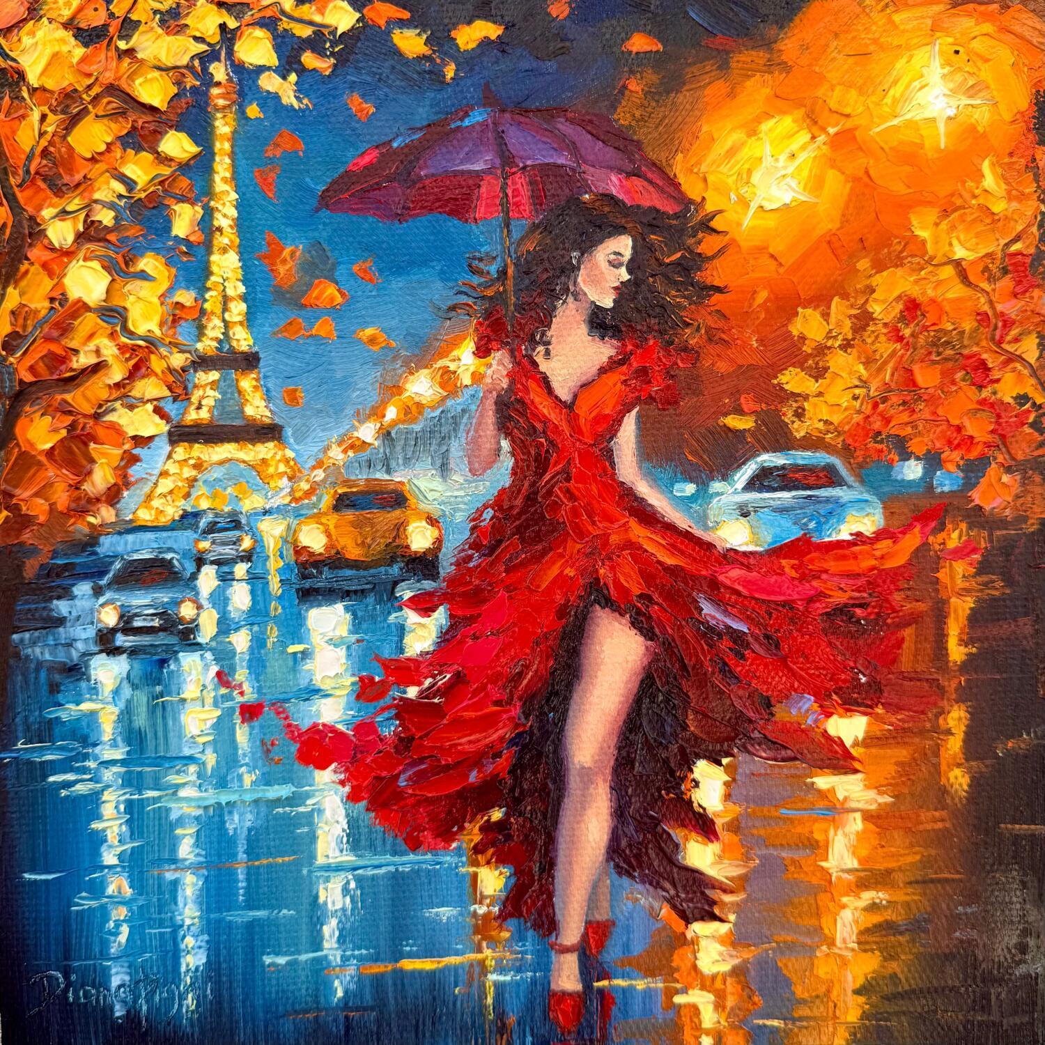 Diana Pigni’s painting "Happiness," measuring 25 x 25 cm, is an exuberant portrayal of joy captured in vivid oil on canvas with thick textures. The scene bursts with energy as a figure, elegantly clad in a flowing red dress, strides confidently through a vibrant Parisian street illuminated by the glowing hues of city lights. Her umbrella, a rich purple, complements the cascade of fiery autumn leaves surrounding her, while the iconic silhouette of the Eiffel Tower stands proudly in the background. Cars reflect the shimmering colors on the glistening wet pavement, enhancing the lively atmosphere of this captivating Parisian night. The painting beautifully encapsulates the essence of happiness through its dazzling palette and dynamic composition.