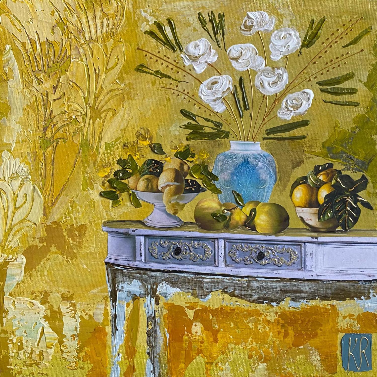 This unique and original contemporary artwork "Le goût des citrons " on the subject of Still-life has been created by the contemporary artist Romanelli Karine.