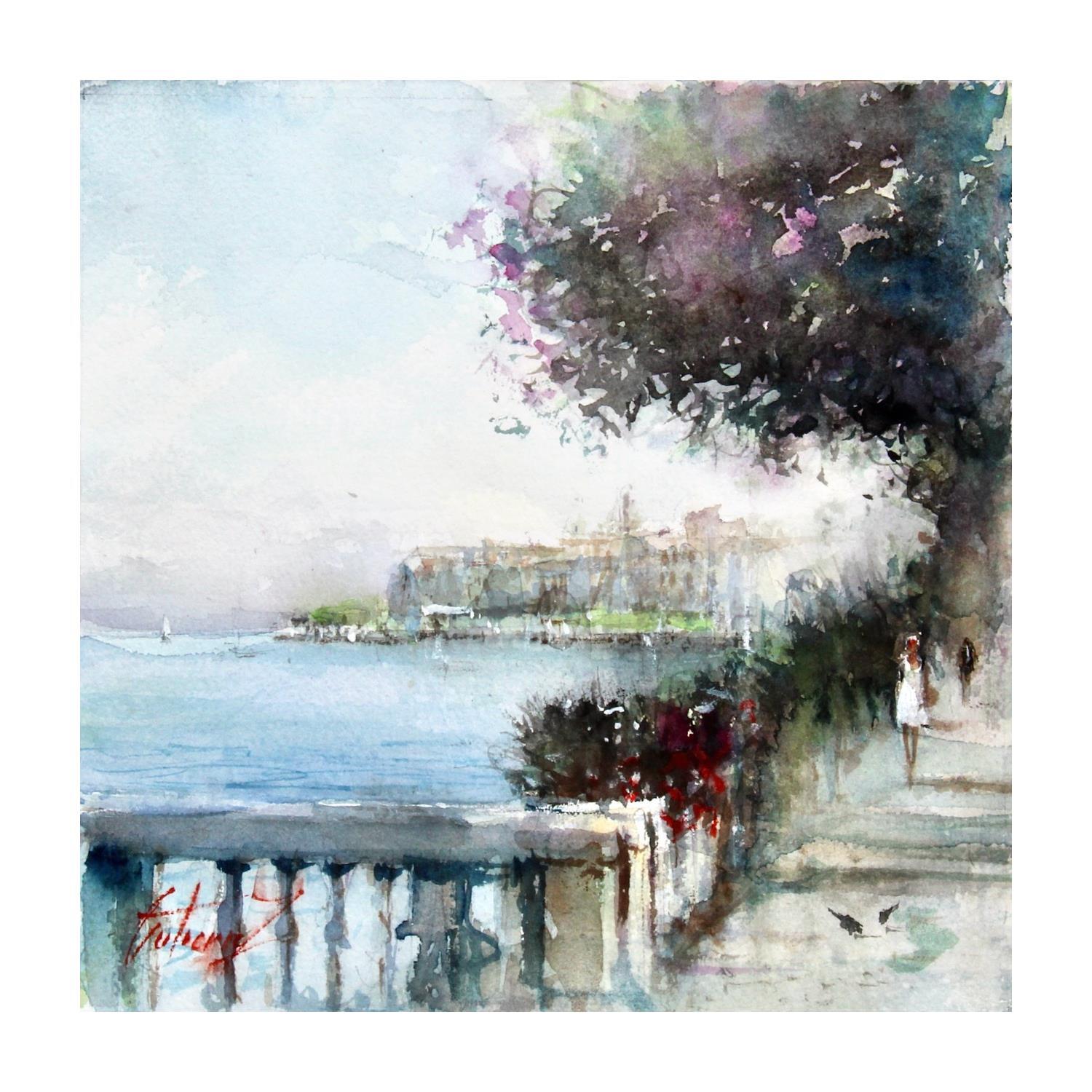 Painting Le lac de Côme by Gutierrez | Painting Figurative Landscapes Urban Watercolor