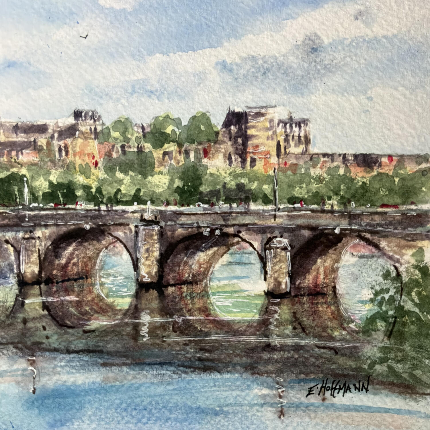 Painting Angers La Maine Pont de Verdun  by Hoffmann Elisabeth | Painting Figurative Urban Watercolor