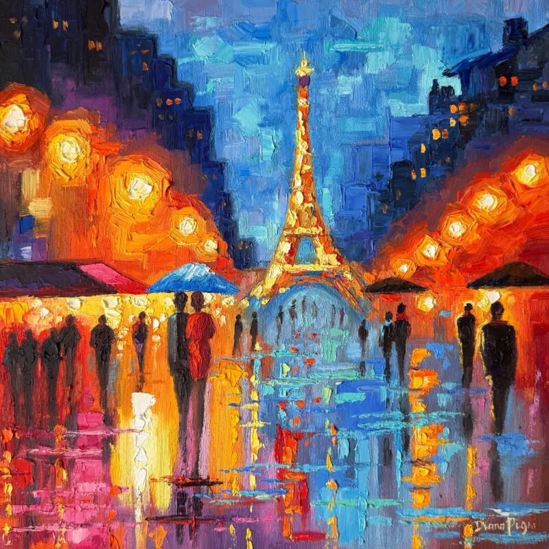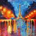 Bring the energy and atmosphere of Paris into your home with this original impasto oil painting capturing a rainy evening. Glowing city lights, reflections on the wet streets, and silhouettes walking under umbrellas create a warm, emotional contrast to the cool blue tones of the Night sky. Painted with bold palette knife strokes and vivid colours, each piece is completely unique, an original artwork on 36 x 36 cm canvas.