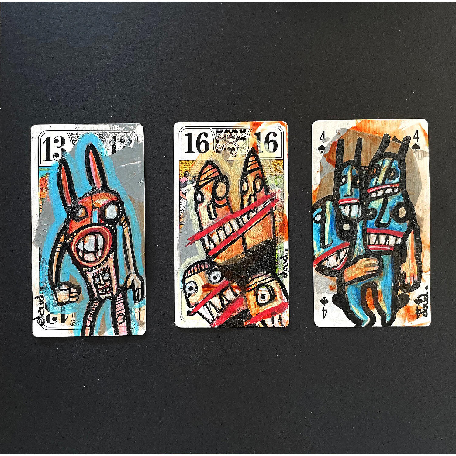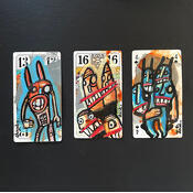 The Breton Loic Tarin, aka Doudoudidon, passed the baccalaureate, then a degree in advertising graphic design. He started off creating images and illustrations, and more recently it clicked into place for him that he should start an artistic life. Influenced by his often technical and scientific readings and listening, he has long wondered about the layout of the universe, Darwinian theories, human sciences… Considering that "he knows nothing", he creates poetic, expressive and intuitive "paintings" (for him painting his first and foremost silent poetry). The idea of distortion of media is the basis of his artistic practice. He likes to use what is initially recyclable waste. He also likes to distort objects like playing cards with themes inspired by the Middle Ages.