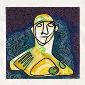 This unique work of art, is a portrait of a person from the front made of a single continuous black line in yellow filled posca, on the lower right side you can see a breast and on the lower left side a hand, in dark background and with lines in cold colors like a coral texture.