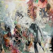 The artist used mixed media: collages, textures, fabrics, pastels and acrylic paint, to create this small-format painting on soft canvas in an abstract, surrealist style.