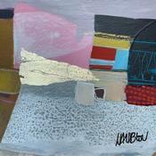 The artist used Cardboard, Acrylic, Gluing, Gold leaf, Paper media on Cardboard to create this Abstract, Small size painting.