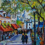 This unique and original contemporary figurative work of art was created by the painter Cèdanne. The artist used a variety of techniques to create this painting on canvas, treating this street scene in Montmartre with his own distinctive style.