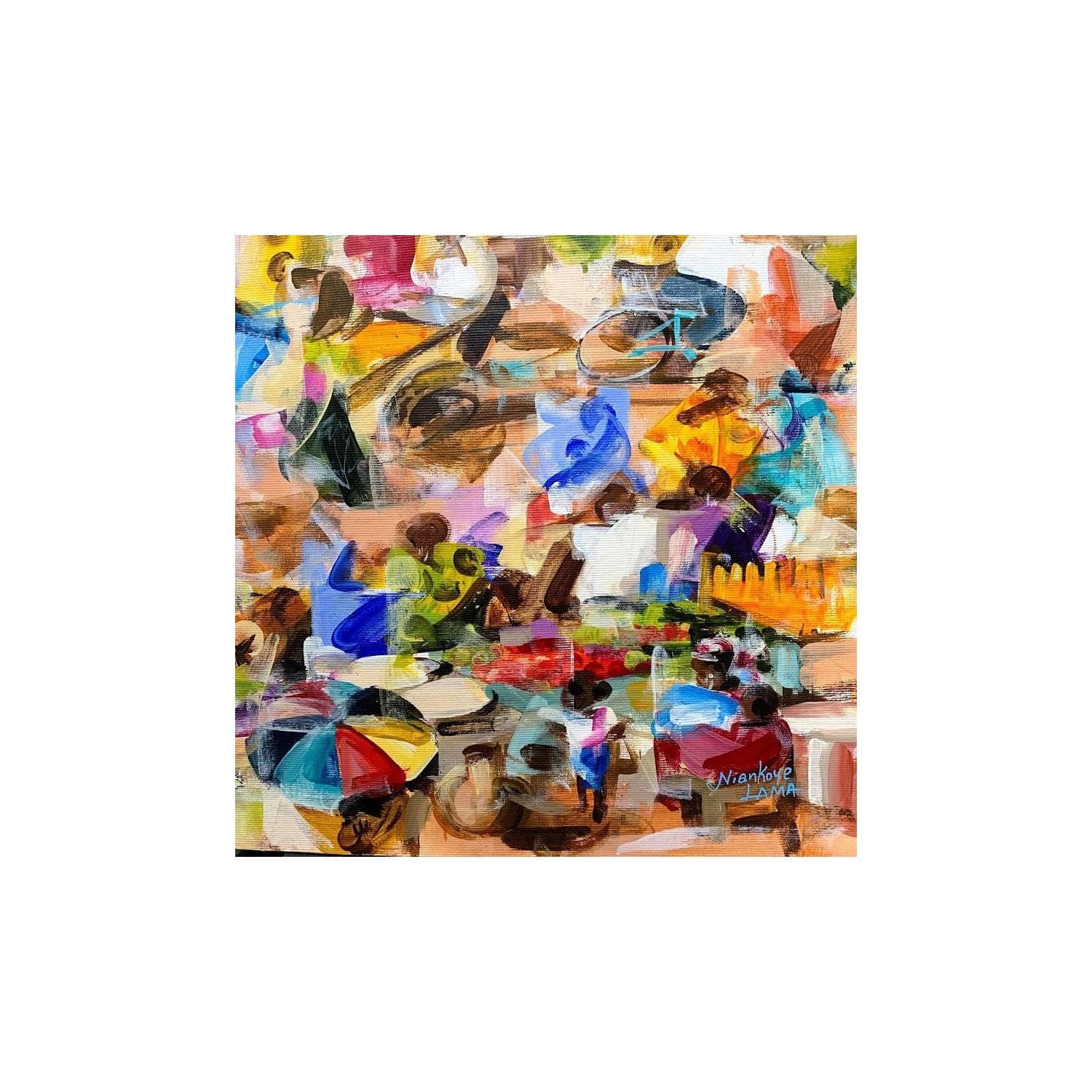 Niankoye's artistic journey began in his hometown N'zérékoré on the southern side of the Republic of Guinea. His passion for drawing and painting led him to go to the National School of Fine Arts in Conakry (the capital) in the 70's. With a degree in graphic arts, he attended various workshops and experimented with different techniques. Very attentive to the world of shapes and colours, he began by passionately copying nature. He travelled in his own country, to the Ivory Coast and finally to France, where he moved in 1990. He worked as a designer, illustrator and fashion designer, but soon decided to devote himself to painting. Travelling and discoveries opened other perceptions of the world to him and gave him a new vision of art. He was freed from traditional constraints and has leaned towards contemporary art since 2000, and has finally thrived in his abstract creations.