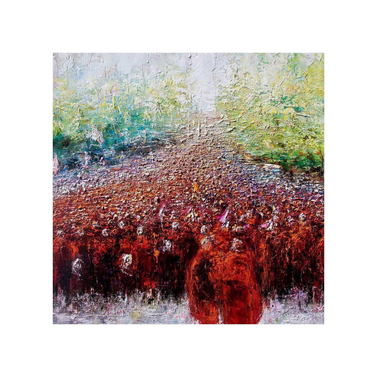 The work plays on the complementary colors red and green to enhance the contrasts and movement of the crowd.