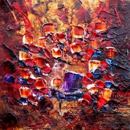 Le concert avec pianiste is a work that oscillates between abstraction in the periphery and naive art in the center and the representation of the instrumentalists. The motif is painted in knife and oil, and plays on a harmony of warm colors (shades of red, orange) and metallics (gold, copper, silver...). The square heads of the figures are inspired by Nicolas de Staël's "Parc des Princes" series. The staging highlights the central pianist, playing on circularity (the formation) and verticality (the background). The conductor, isolated and in a masterly posture, concludes the lower part of the work. The overall tone is flamboyant or baroque... depending on your sensibilities.