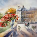 Flowers in the Luxembourg Gardens In the soft light of Paris, flowers burst into bloom in the foreground like a silent celebration. In the distance, the Luxembourg Gardens breathe calmly between elegant facades. A watercolor painting full of warmth, poetry, and Parisian charm.