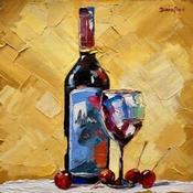 "Sip and Savour" by Diana Pigni is a striking 19x19 cm oil painting that beautifully captures the essence of enjoying fine wine. The vivid composition features a wine bottle and a glass, their forms rendered with bold, textured brushstrokes. The deep, rich tones of the bottle and the multicolored reflections in the glass contrast elegantly against the warm, golden background. Scattered cherries at the base add a touch of whimsy and vibrancy. Diana's masterful use of impasto technique brings depth and texture to the piece, evoking a sensory experience that celebrates the pleasures of wine.