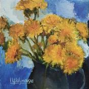 This painting by Iryna Malynovska captures the vivacity of yellow dandelions, arranged in a blue vase against a background of bluish hues. Vibrant colors and rich textures create a bright, cheerful scene, highlighting the simple, natural beauty of dandelions.