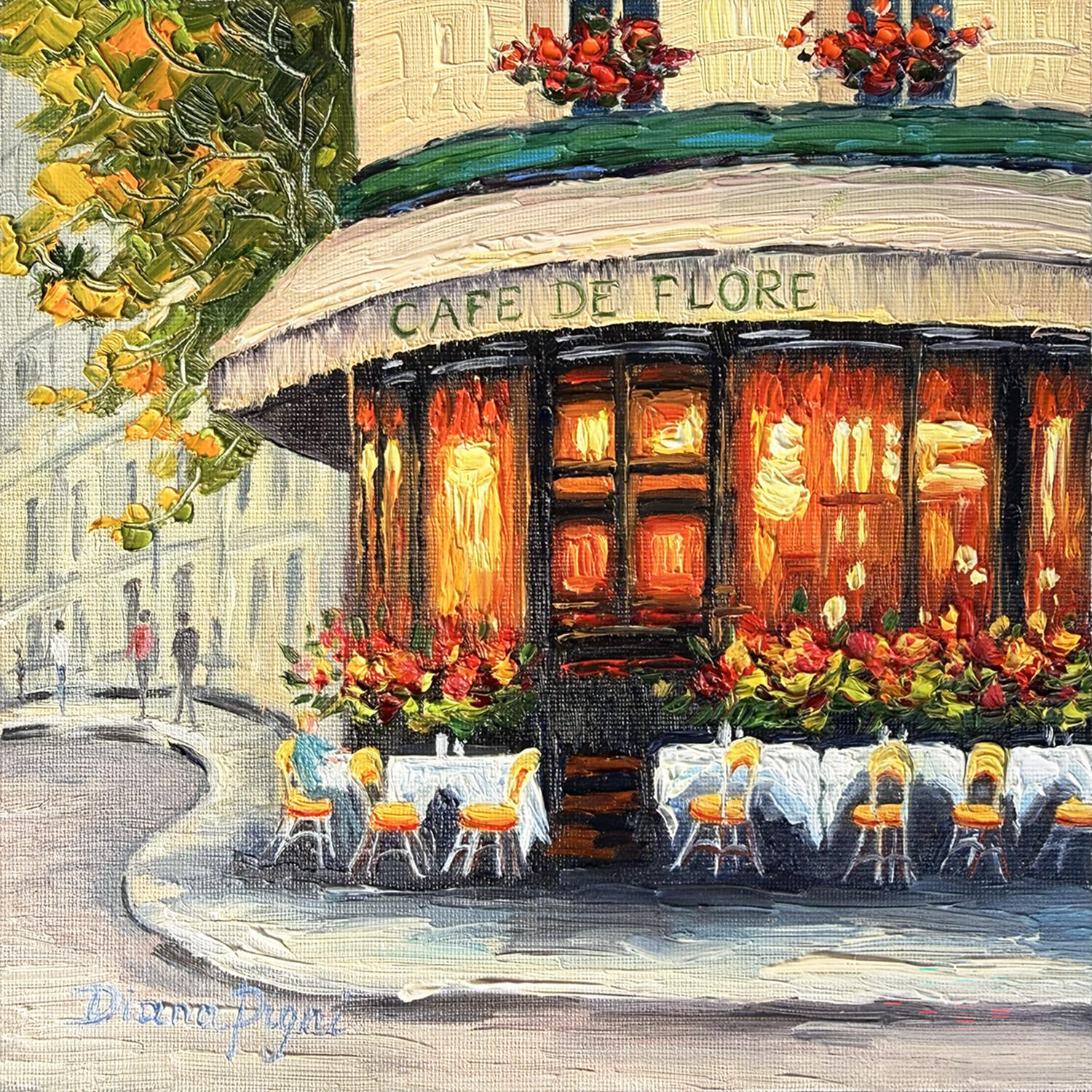 Warm golden light spills from the windows of Café de Flore, drawing you into a quiet Parisian moment where time seems to slow down. The soft glow contrasts beautifully with the cool tones of the street, creating an intimate atmosphere that feels both lively and peaceful at once.