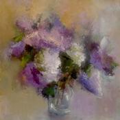 The oil painting depicts a lush bouquet of lilacs in shades of violet, lavender and white, delicately arranged in a transparent glass vase. The flowers, painted with flowing, textured brushstrokes, seem to evaporate into the soft, pastel background, creating a harmony between composition and background. The green leaves provide a subtle, balanced contrast, accentuating the natural freshness of the bouquet. The glass vase, barely outlined, lightly reflects the surrounding colors, adding a touch of elegance and realism. This work evokes a soothing, dreamy atmosphere, celebrating the delicate, ephemeral beauty of nature.
