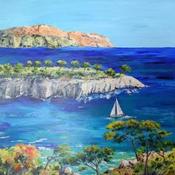 This unique and original contemporary artwork "Voyage dans les calanques, Port-Pin" on the subject of Landscapes has been created by the contemporary artist Rey Ewa.