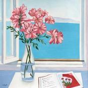 This unique and original contemporary artwork "Flowers and book with sea view" was created by contemporary artist Sally B.