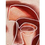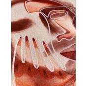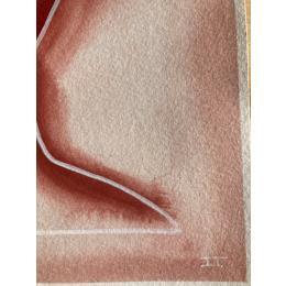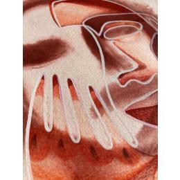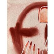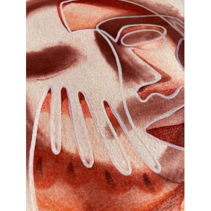This unique work of art is a portrait of a person in front, with only one hand on his left, made of a single continuous white line in Posca, filled with colored pencils to create facial volumes like a mask, with a very different texture in the background, giving a sense of depth of field. Generally based on reds and oranges.