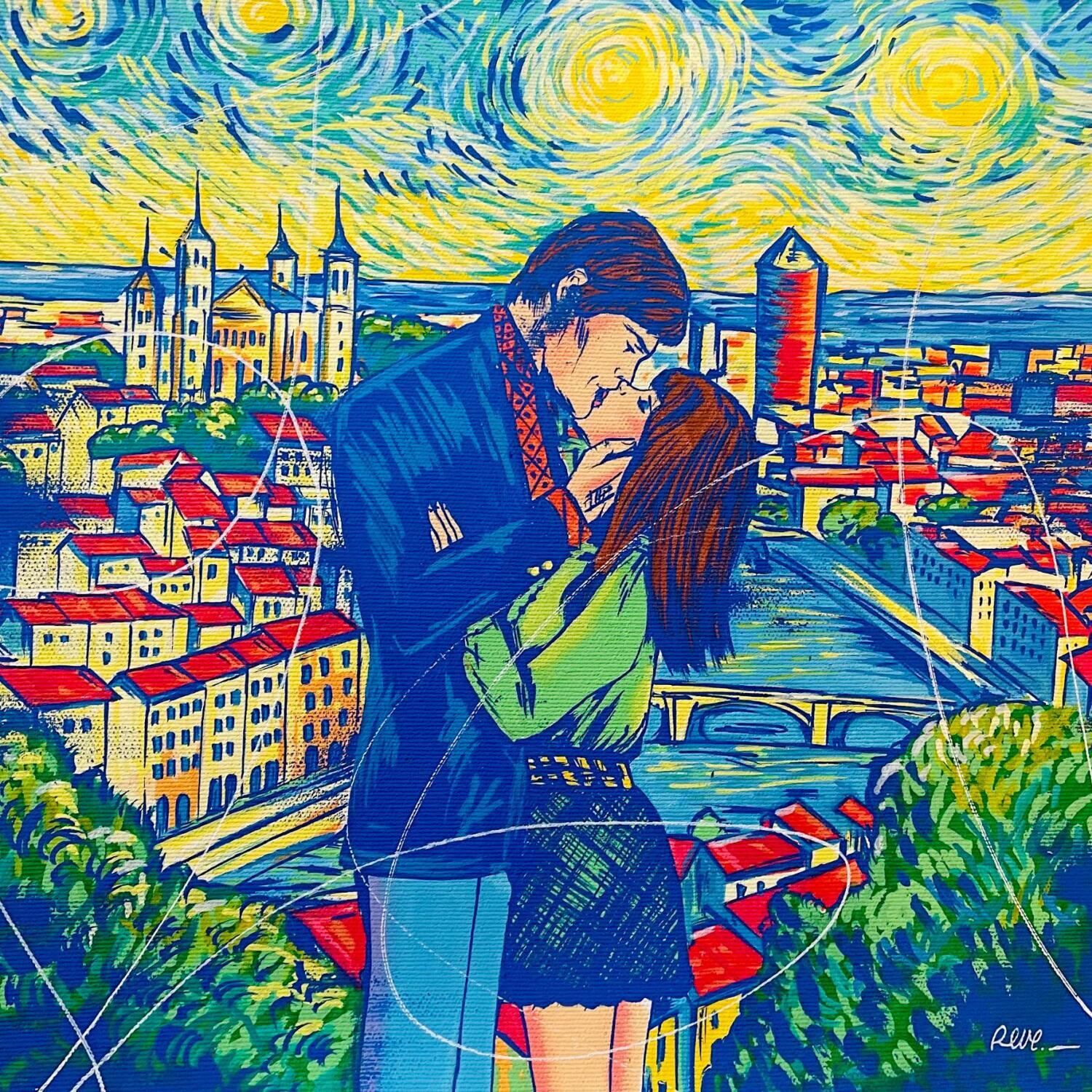 This unique and original contemporary artwork "Coup de foudre à Lyon" on the subject of Pop icons has been created by the contemporary artist Revel.
