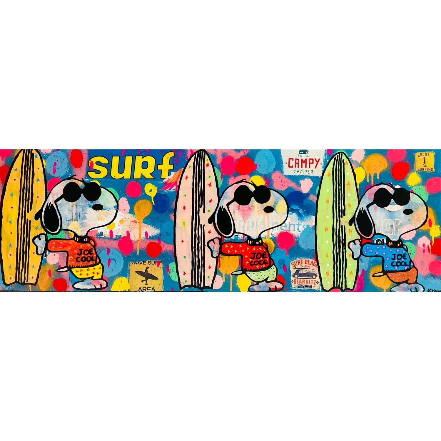 This unique and original contemporary artwork "Snoopy Surf" on the subject of Pop icons has been created by the contemporary artist Kikayou.