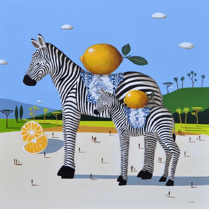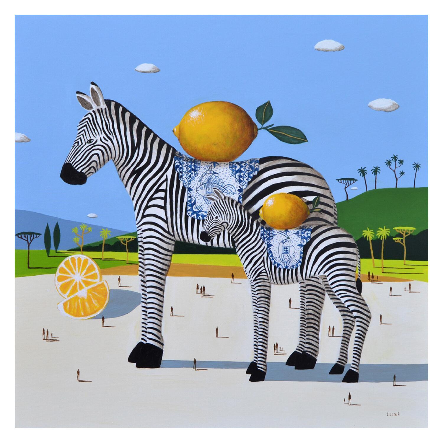 This unique and original contemporary artwork "Zèbre et zèbron aux citrons" on the subjects of Life style, Animals, Landscapes has been created by the contemporary artist Lionnet Pascal.