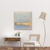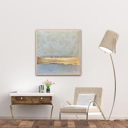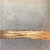 Textures, gilded pink metallic leaves and craquelures contrast with neutral, soft colors: beige gray at the top and cracked gray revealing a rust-colored background. The gilding illuminates the painting and the room in which it stands, this light is very changeable depending on the time of day and the location of the viewer, so you have a thousand paintings in ONE.