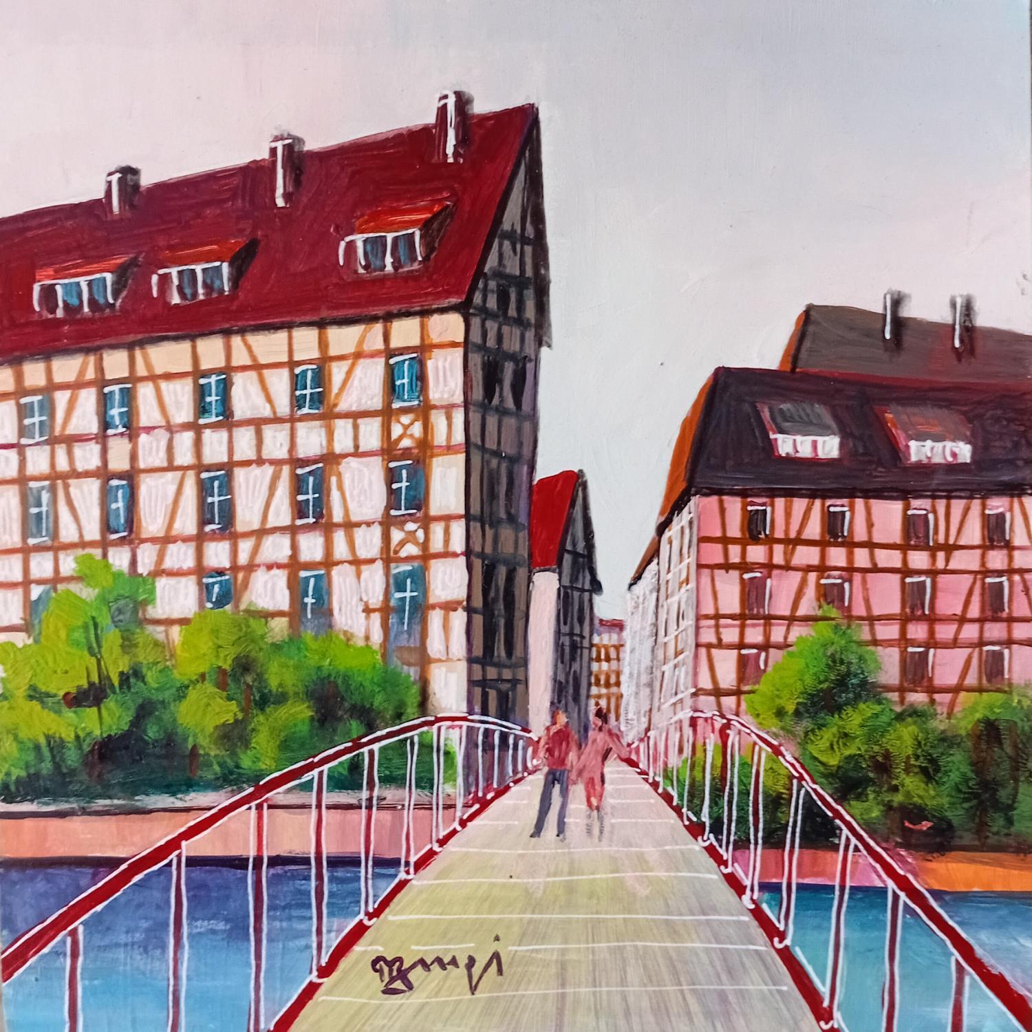 Painting AN183 SUR LE PONT by Burgi Roger | Painting Figurative Urban Life style Architecture Acrylic