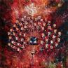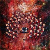 Le concert avec pianiste is a work that oscillates between abstraction in the periphery and naive art in the center and the representation of the instrumentalists. The motif is painted in knife and oil, and plays on a harmony of warm colors (shades of red, orange) and metallics (gold, copper, silver...). The square heads of the figures are inspired by Nicolas de Staël's "Parc des Princes" series. The staging highlights the central pianist, playing on circularity (the formation) and verticality (the background). The conductor, isolated and in a masterly posture, concludes the lower part of the work. The overall tone is flamboyant or baroque... depending on one's sensibilities.