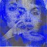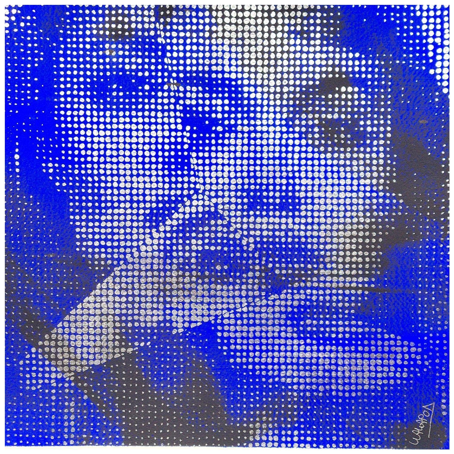 The artist has here drawn his portrait by accumulating hundreds of points . The artist has first worked the background by finding a balance between black and blue klein to then add these dots of silver colors mirror.