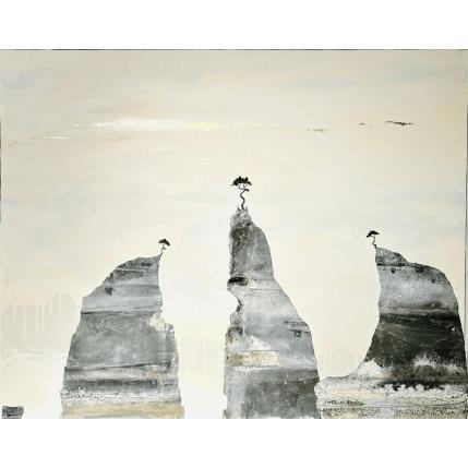 Using raw materials, sand, Sienna, oxidised zinc, gold or lead leaf, as well as tinted areas with oil and acrylic paints in his works, the artist François-Régis Lemonnier invents a space made of points, pure lines and geometric forms for man, in which he has to find his place. His practice is above all else a look at man, each little silhouette able to represent a cultural, geographic, mythological or historical symbol in the painter’s imagination. Whether he places man in the marine world with his Saint-Malo origins or in a mountainous or urban landscape, the painter’s reflection tends towards the universality of the place of man in his environment.