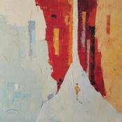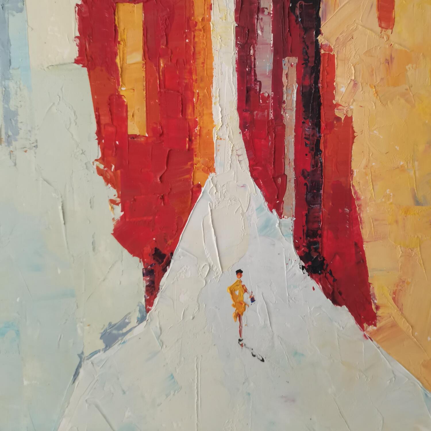 This unique and original contemporary artwork "Vestida de groc" on the subject of Urban has been created by the contemporary artist Tomàs.