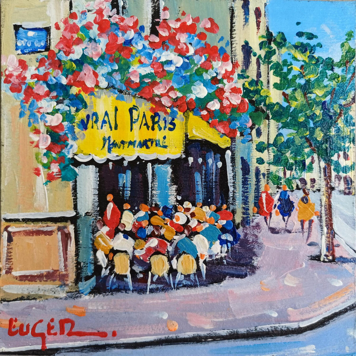 This unique and original contemporary artwork "TERRASSE FLEURIE A MONTMARTRE" on the subjects of Architecture, Life style, Urban has been created by the contemporary artist Euger.