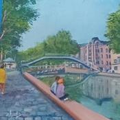 This unique and original contemporary artwork "Petite pause au bord du canal Saint Martin à Paris" on the subjects of Landscapes, Life style, Urban has been created by the contemporary artist Degabriel Véronique.