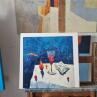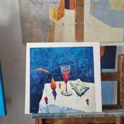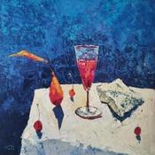 This unique and original contemporary artwork "Formatge amb vi" on the subject of Still-life has been created by the contemporary artist Tomàs.