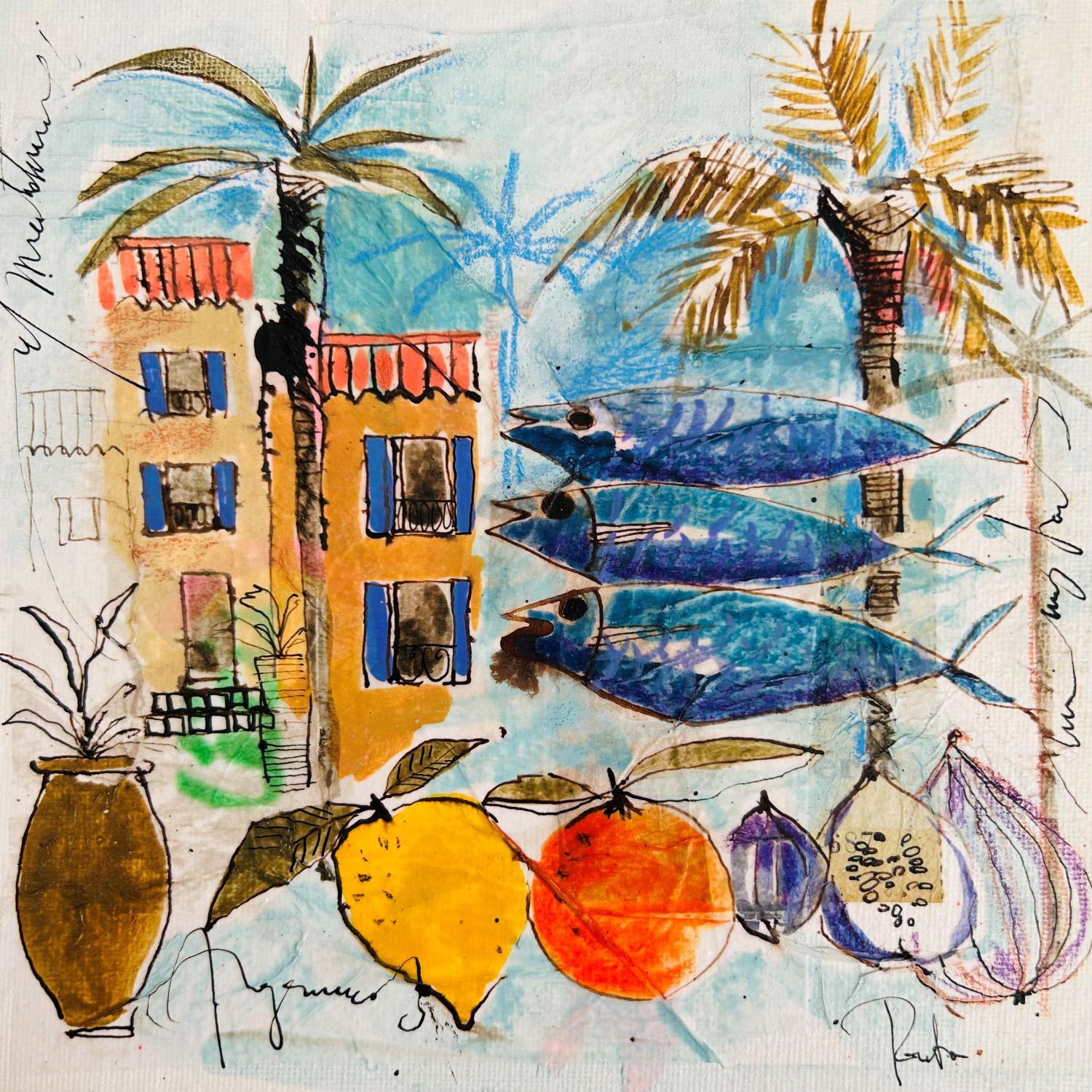 This unique and original contemporary artwork "Les 3 sardines" on the subjects of Nature, Landscapes, Life style has been created by the contemporary artist Colombo Cécile.