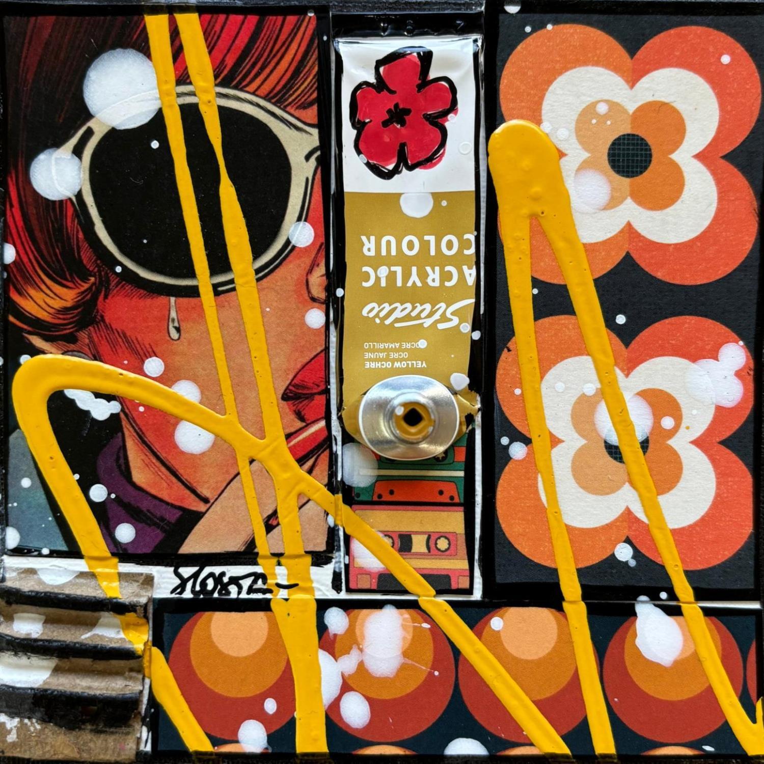 The artist used Acrylic, Gluing, Upcycling media on Canvas board to create this Pop-art, Small size painting.