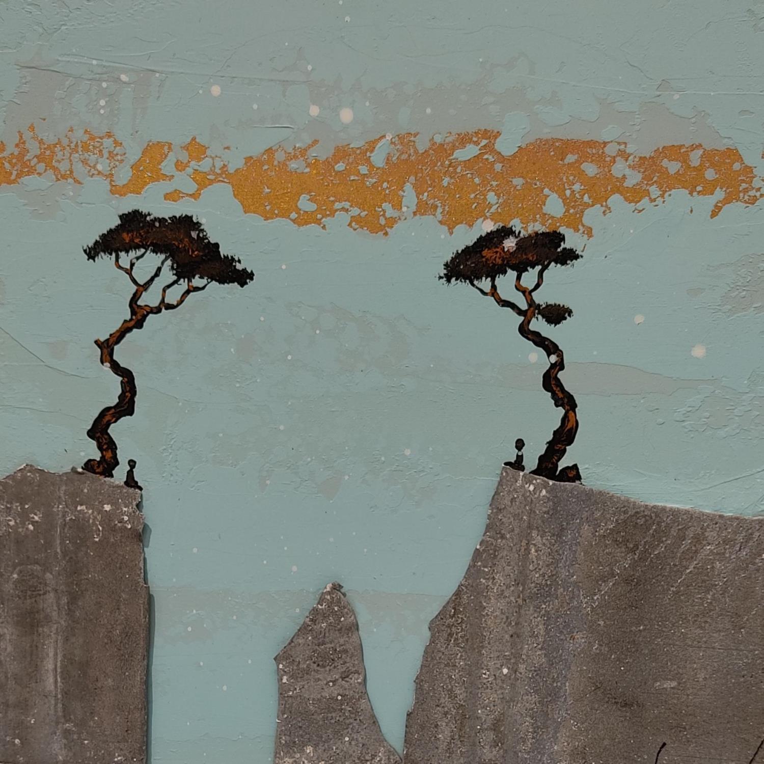 François-Régis Lemonnier’s paintings explore man and his environment. In his paintings, tiny characters float in large spaces, move about and meet each other, trying their own condition, solitude, joy, poverty, solidarity and oversight. Their tiny size highlights their great humility: man and his destiny, singular, happy or dramatic, in a world of constant change.\n\nFar from representation and realism, François-Régis Lemonnier’s paintings rise above and form open windows on the world, an immense world, swallowing an increasingly small, almost invisible man. These journeys to the centre of the universe are also journeys to our inner self, the deepest part of our inner being, where body and form disappear to leave space for the dissipation of the mind.
