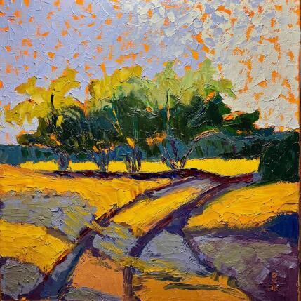 Karen O'Donnell paints in oils, on golden or orange backgrounds that she calls "confetti". This starting tone creates a luminous contrast, often visible in the sky of her landscapes. Her inspiration comes from photos taken in nature - a deer spotted by a trail camera, an insect in full flight or a sunset over red rocks. Her style is reminiscent of Impressionism, influenced by Gretchen Lopez and her own sensitivity to color. Each work is a visual surprise, where unexpected shapes sometimes slip in. Her paintings aim to evoke emotion and joy in the viewer.