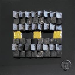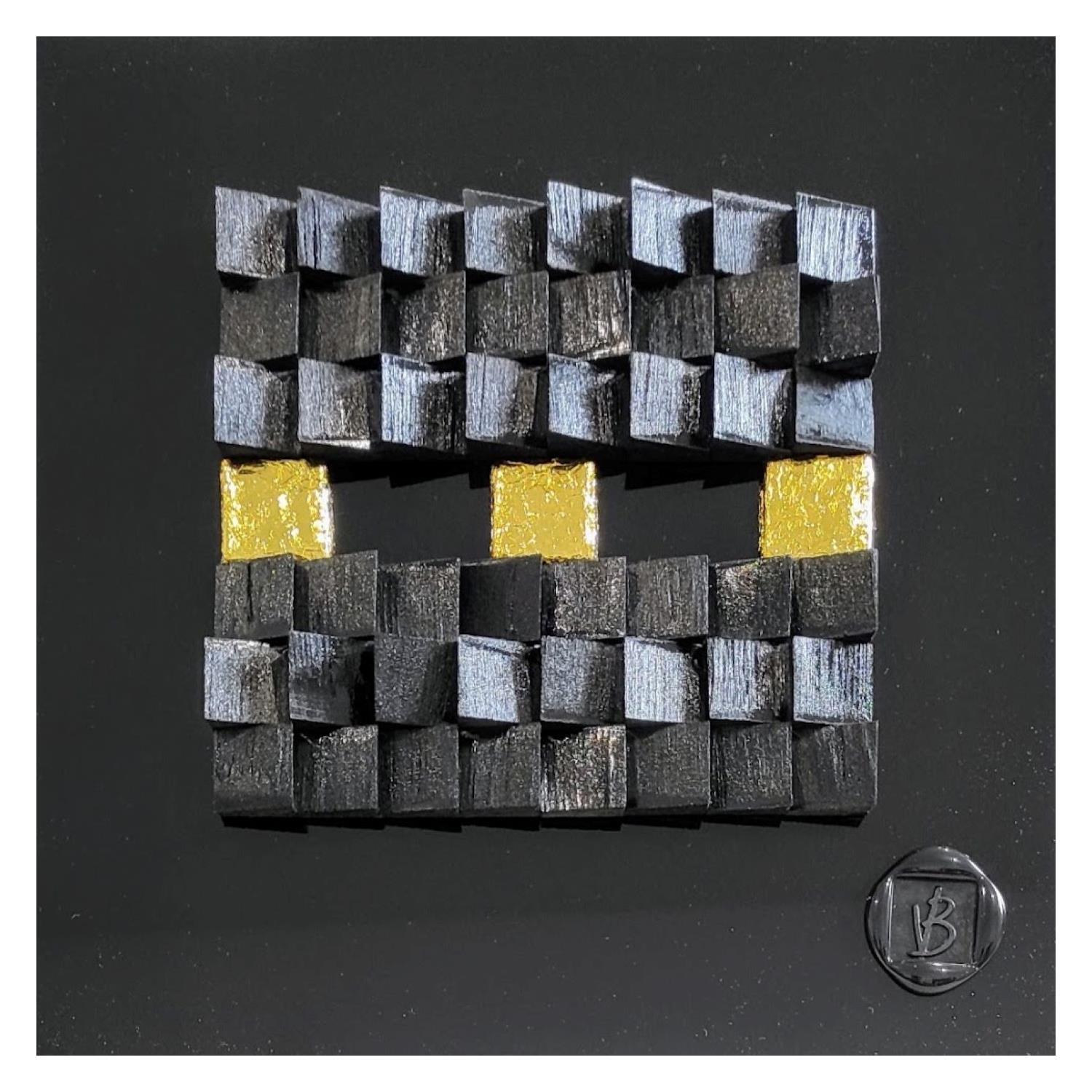 The artist used Wood, Gluing, Metal, Acrylic media on Dibon to create this Abstract, Small size painting.