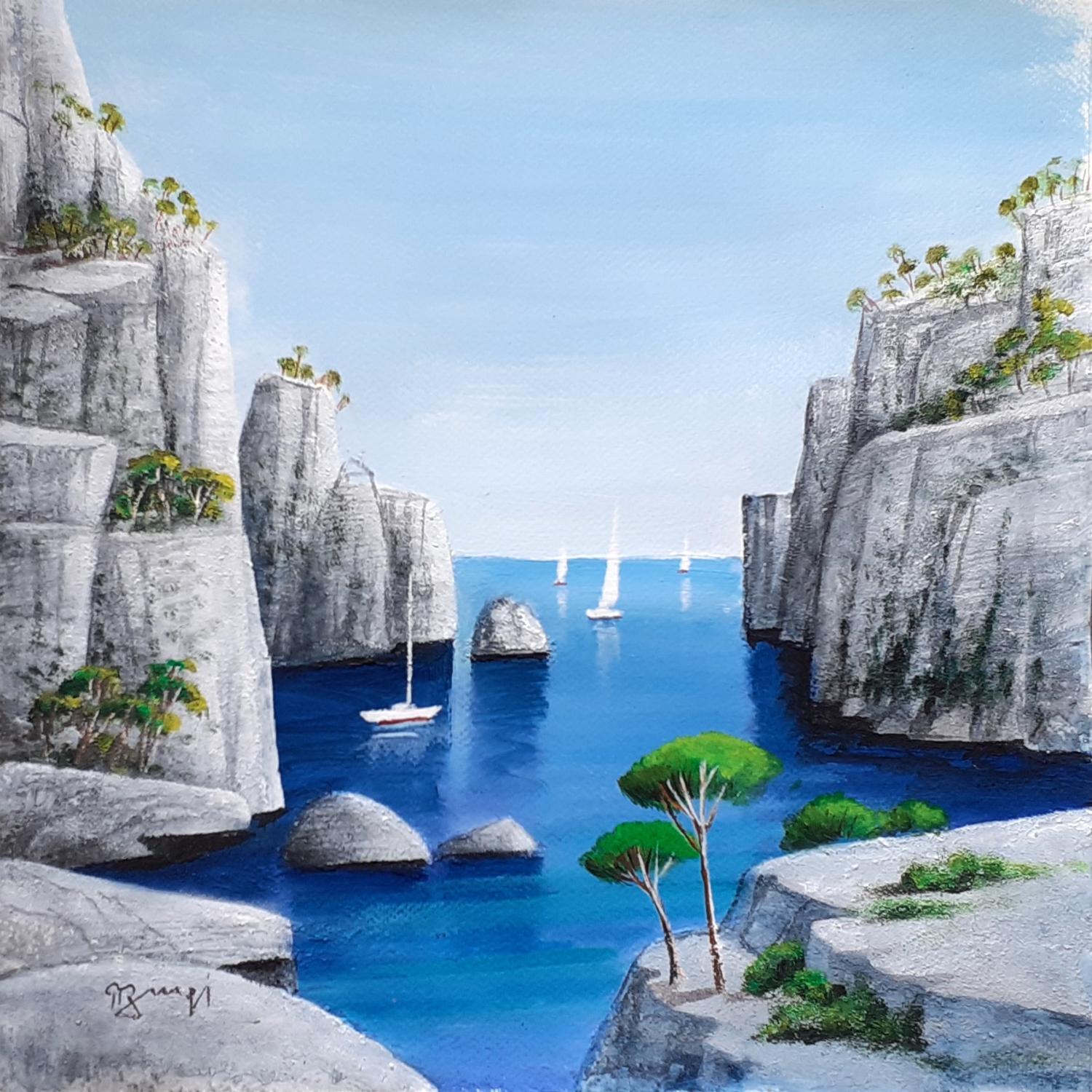 This unique and original contemporary artwork "AQ45 CALANQUE AU TROIS ILOTS" on the subjects of Landscapes, Marine has been created by the contemporary artist Burgi Roger.